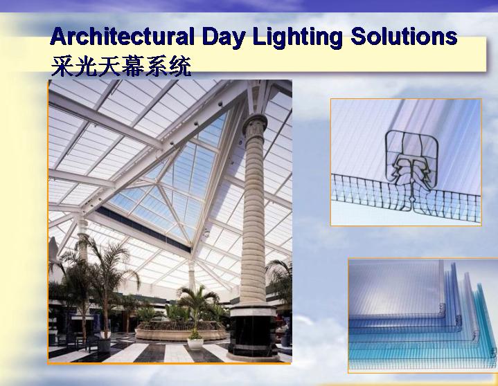 陽(yáng)光板為聚碳酸酯透明板的商品名稱,簡(jiǎn)稱PC板,是目前國(guó)際上普遍采用的一種高強(qiáng)度、透光、隔音、節(jié)能的新型裝飾材料。它具有輕質(zhì)、耐候、超強(qiáng)、阻燃、隔聲的優(yōu)異性能,得到建筑設(shè)計(jì)、裝飾工程、環(huán)境工程、廣告業(yè)的廣泛認(rèn)同。