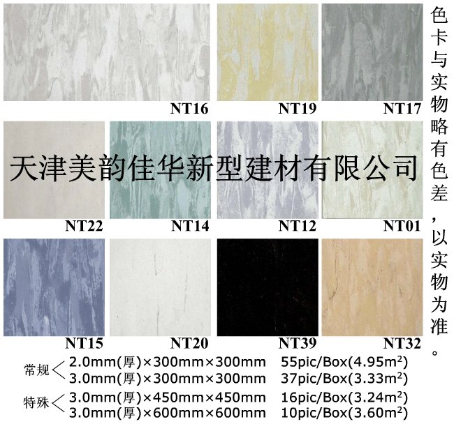產(chǎn)地/廠家:天津/LG樂金新型建材 品牌:LG 規(guī)格(mm):2.0mm(厚)×300mm(寬)×300mm(長(zhǎng)) 3.0mm(厚)×300mm(寬)×300mm(長(zhǎng)) 3.0mm(厚)×450mm(寬)×450mm(長(zhǎng)) 3.0mm(厚)×600mm(寬)×600mm(長(zhǎng)) 包裝:55片/箱(4.95平方米) 37片/箱(3.33平方米) 16片/箱(3.24平方米) 10片/箱(3.60平方米) 耐磨層(mm):同質(zhì)體 阻燃等級(jí):B1 適合場(chǎng)合:辦公樓、學(xué)校、醫(yī)院、商業(yè)、餐廳、工廠。 產(chǎn)品特性:1單層結(jié)構(gòu),耐磨性好,壽命長(zhǎng); 2完美再現(xiàn)各種大理石花紋; 3施工與維護(hù)極其方便; 4不易燃,已通過國(guó)家固定滅火系統(tǒng)和耐火構(gòu)件質(zhì)量監(jiān)督檢驗(yàn)中心檢測(cè); 5環(huán)保產(chǎn)品,已通過國(guó)家環(huán)境測(cè)試中心檢測(cè),無毒,無公害。