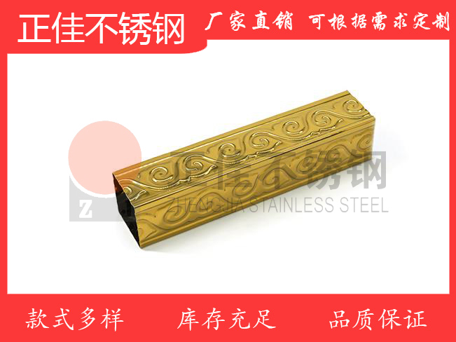 不銹鋼花紋管是在不銹鋼裝飾管的基礎(chǔ)上,通過(guò)輥壓工藝,把各式各樣的花紋圖案壓印出來(lái)。而正佳的不銹鋼花紋管30x30鍍金祥云的表面就擁有祥云花紋,十分受新老顧客的歡迎。不僅如此,其表面還采用了真空電鍍著色工藝,使其表面呈現(xiàn)出鈦金色。其材質(zhì)是304,耐腐蝕性能顯著。