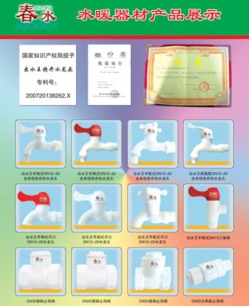 河北春水水暖器材有限公司研發(fā)的膠墩密封材料塑料水龍頭、快開水龍頭、塑料止回閥、塑料快接閥門都是國家級(jí)專利產(chǎn)品,填補(bǔ)了國內(nèi)空白。本廠日生產(chǎn)水暖件3-5萬套,在各省會(huì)地市基本上都設(shè)有總經(jīng)銷商,并遠(yuǎn)銷中東、東南亞等地區(qū)。